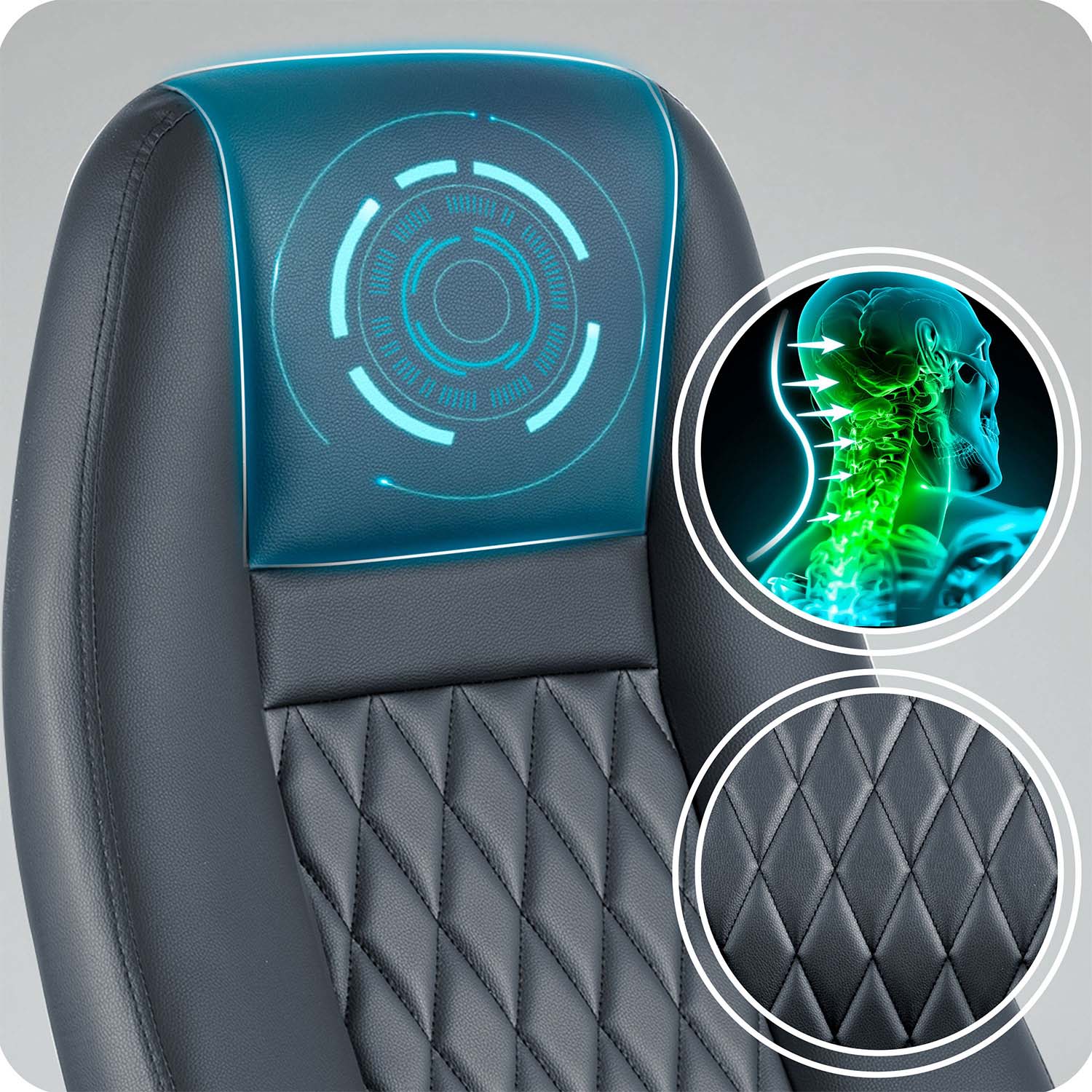 Wyprofilowana część lędźwiowa pomaga utrzymać ergonomiczną bezpieczną postawę. Wyprofilowany zagłówek równo rozkłada nacisk, odciążając mięśnie i zapobiegając bólom odcinka szyjnego.
